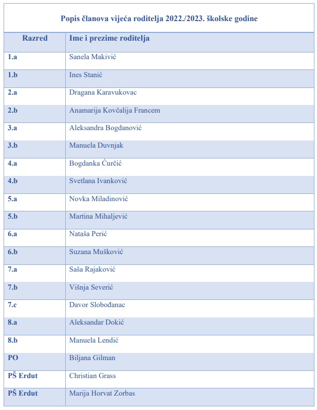 Popis članova Vijeća roditelja, rujan 2022. godine